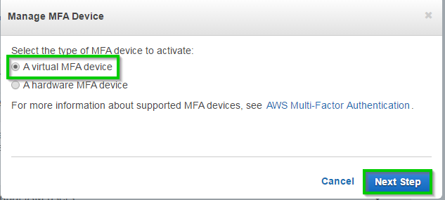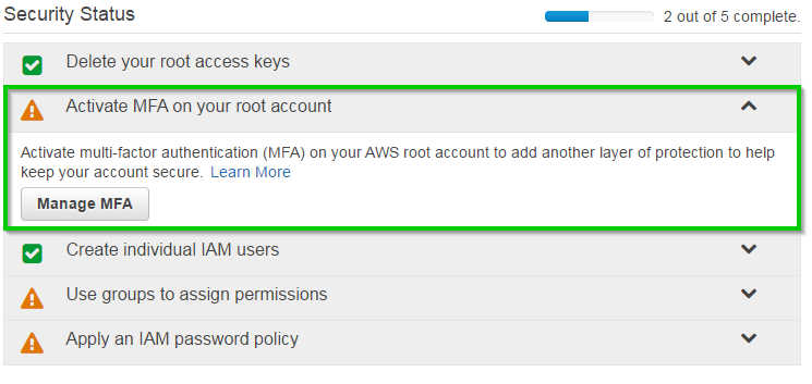 Wracając do sekcji “Security Status” w IAM klikamy “Activate MFA on your root account” i dalej “Manage MFA”