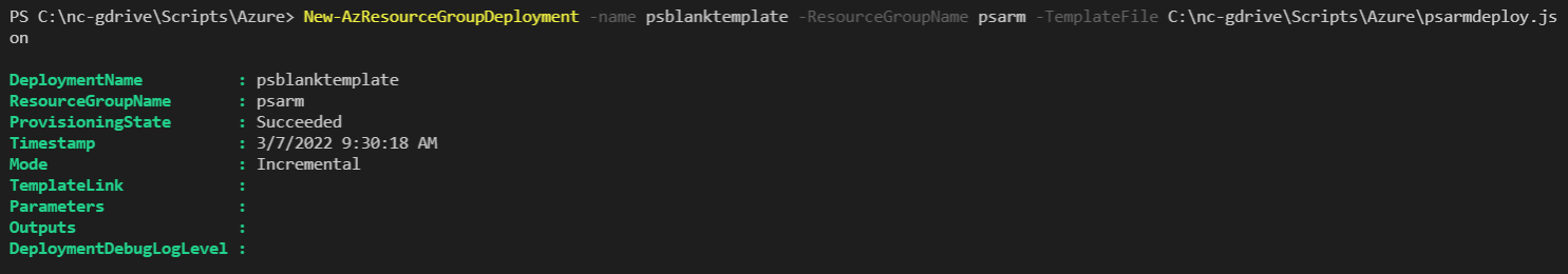 ### Połączenie do konta w Azure z opcją MFA: Connect-AzAccount -TenantId XXXXXXXX-XXXX-XXXX-XXXX-XXXXXXXXXXXX # Stworzenie resource grupy New-AzResourceGroup -Name psarm -Location "East US" # Deployment wcześniej przygotowanego pliku New-AzResourceGroupDeployment -name psblanktemplate -ResourceGroupName psarm -TemplateFile C:\nc-gdrive\Scripts\Azure\psarmdeploy.json