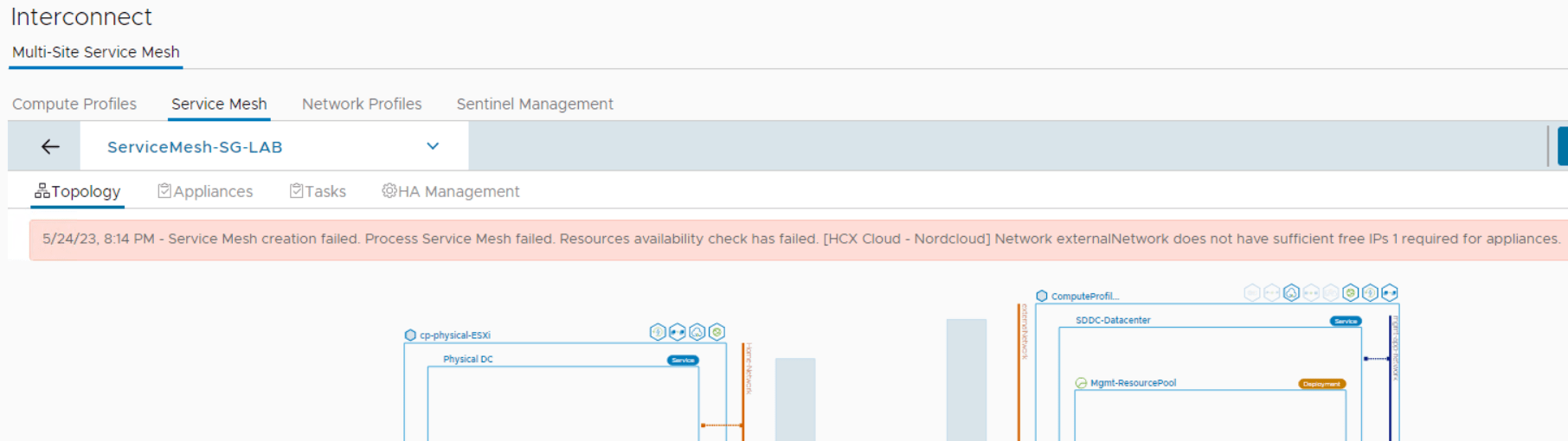 - [VMC on AWS] HCX Service Mesh deployment fails with externalNetwork does not have sufficient free IPs (83106)