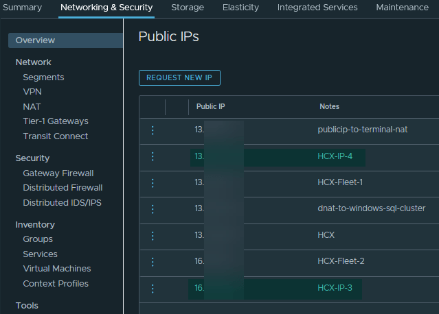 Domyślnie podczas aktywowania HCX w VMware on AWS tworzone są 3 publiczne adresy IP w konsoli VMC: