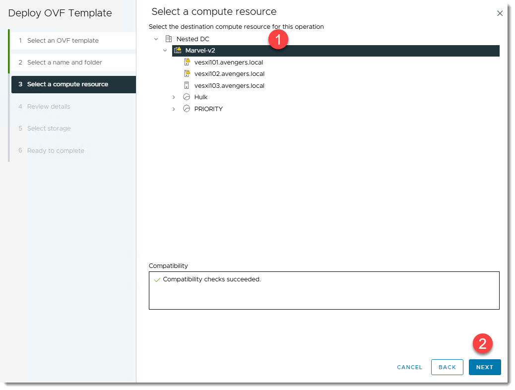 - Wybierz docelowy zasób obliczeniowy. Zaleca się instalację VCDA w tym samym klastrze co vCenter Server.