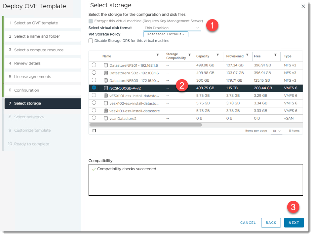 - Zaznacz opcję “Encrypt the virtual machine” i wybierz odpowiedni magazyn danych, najlepiej ten sam, na którym znajduje się vCenter Server.