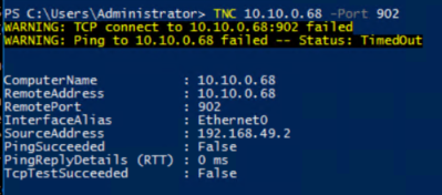 - Testowe sprawdzenie portu 902/TCP (test wykonany z maszyny z segmentu wytworzonego przez konsole VMC)