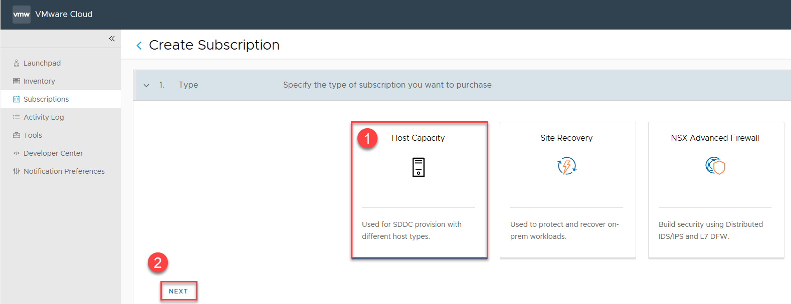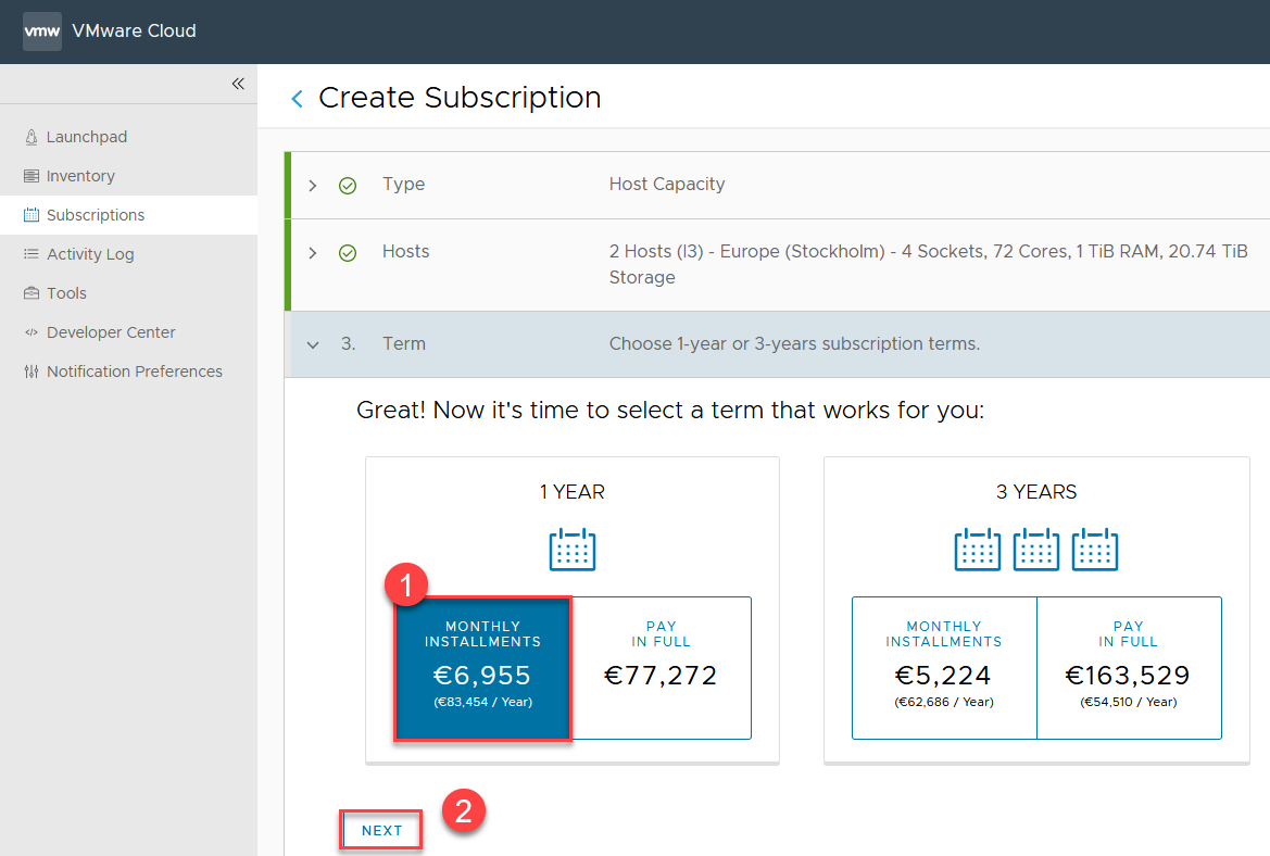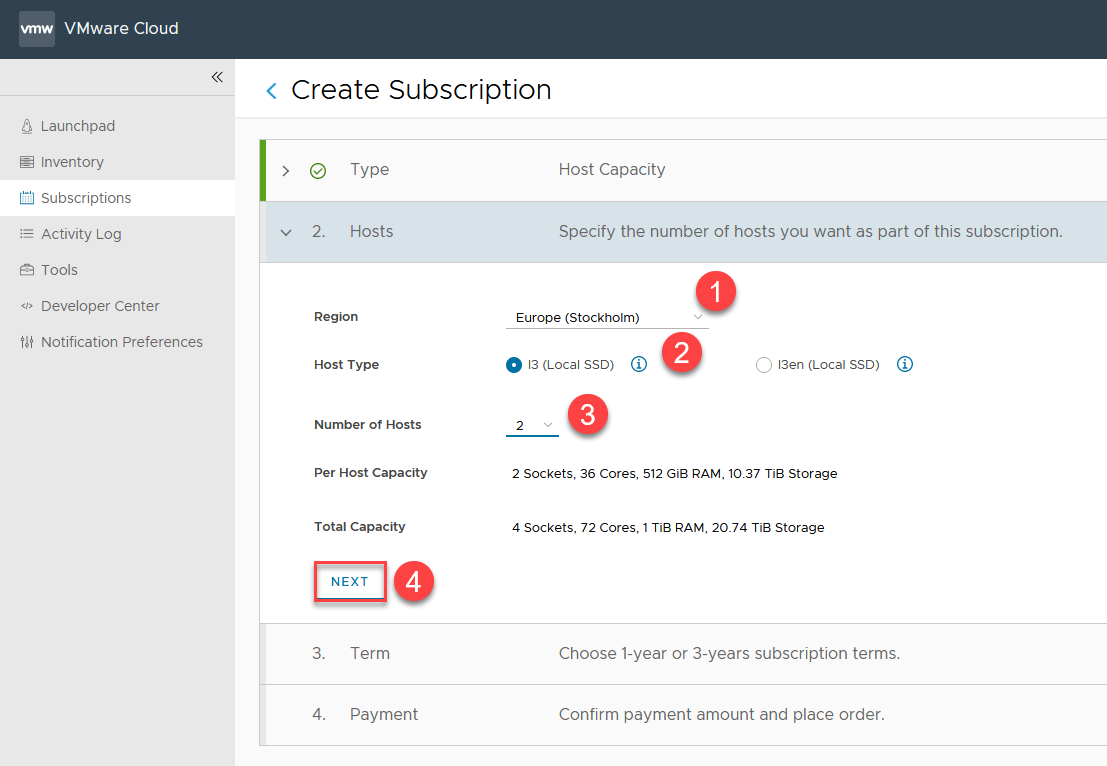 | W tym przypadku interesuje nas tylko subskrypcja na zasoby obliczeniowe serwerów dlatego opcja “Host Capacity” jest odpowiednia i dalej NEXT | |