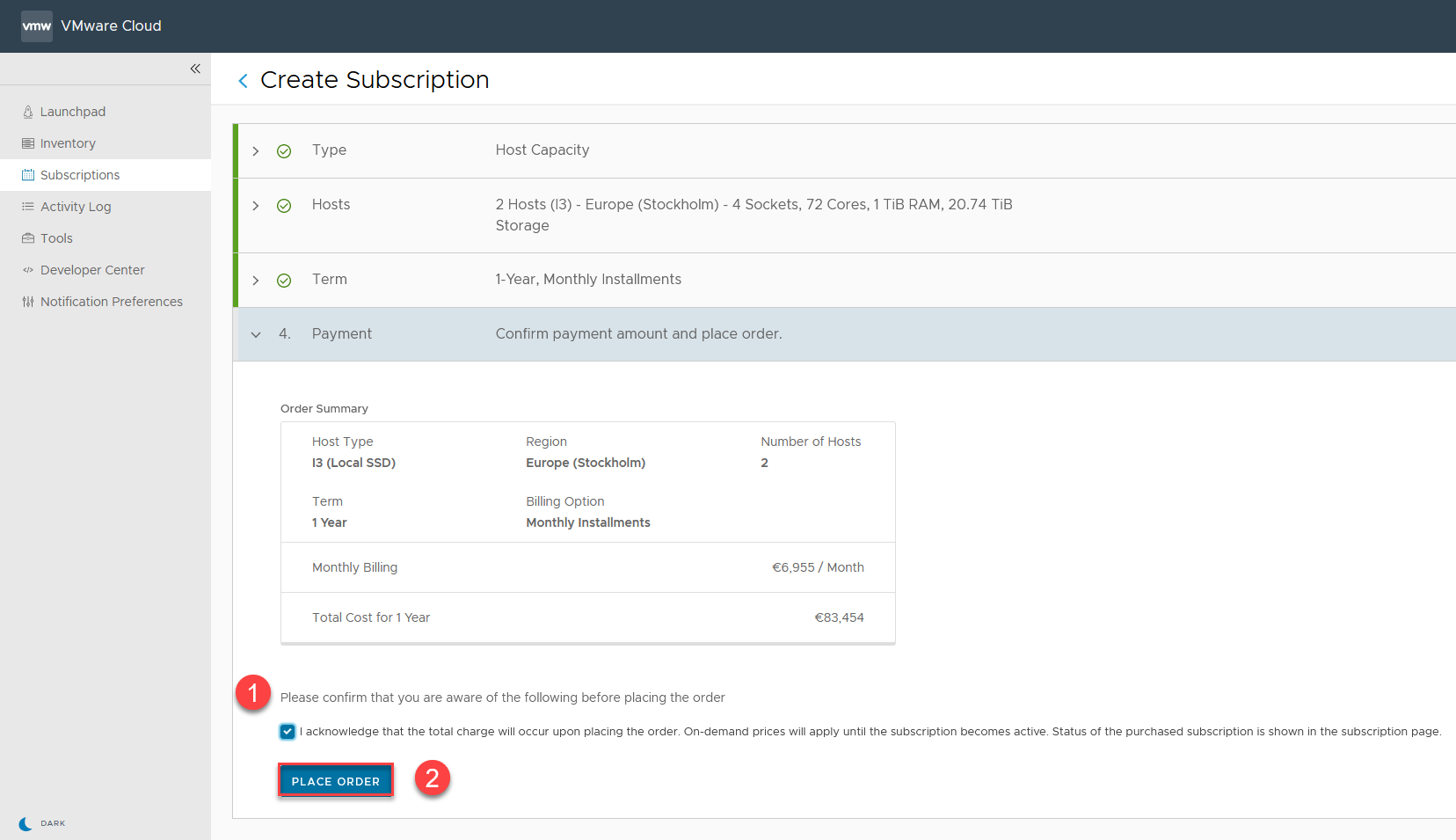 | W podsumowaniu zamówienia należy tylko potwierdzić iż do czasu aktywacji kontraktu hosty działąjące w klastrze będą rozliczane “za godzinę” pracy. Proces kończymy przyciskiem PLACE ORDER. | |