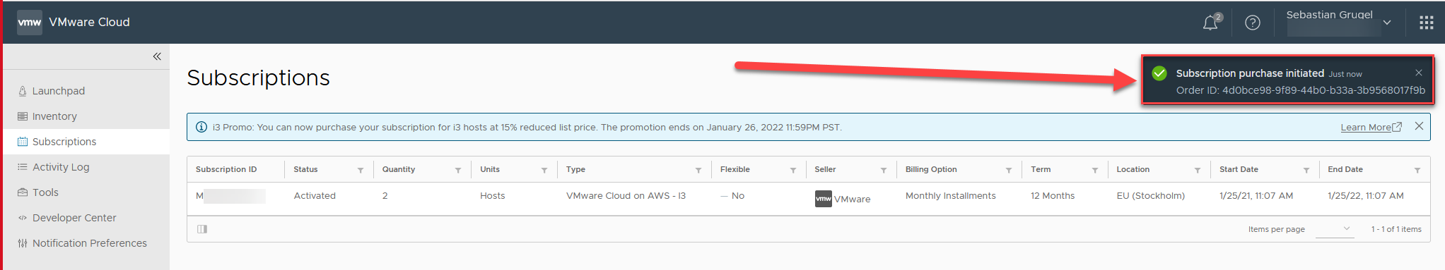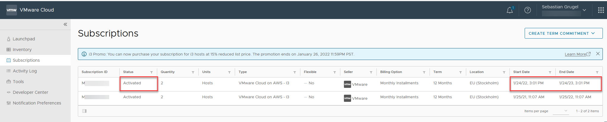 | Po paru minutach jednak jak odświeżymy ponownie powinien zmienić się status zamówienia na “Activated” wraz z datą startu oraz zakończenia subskrypcji. |