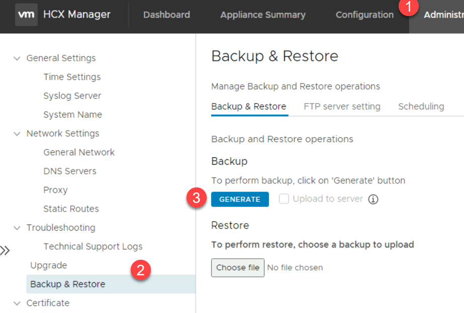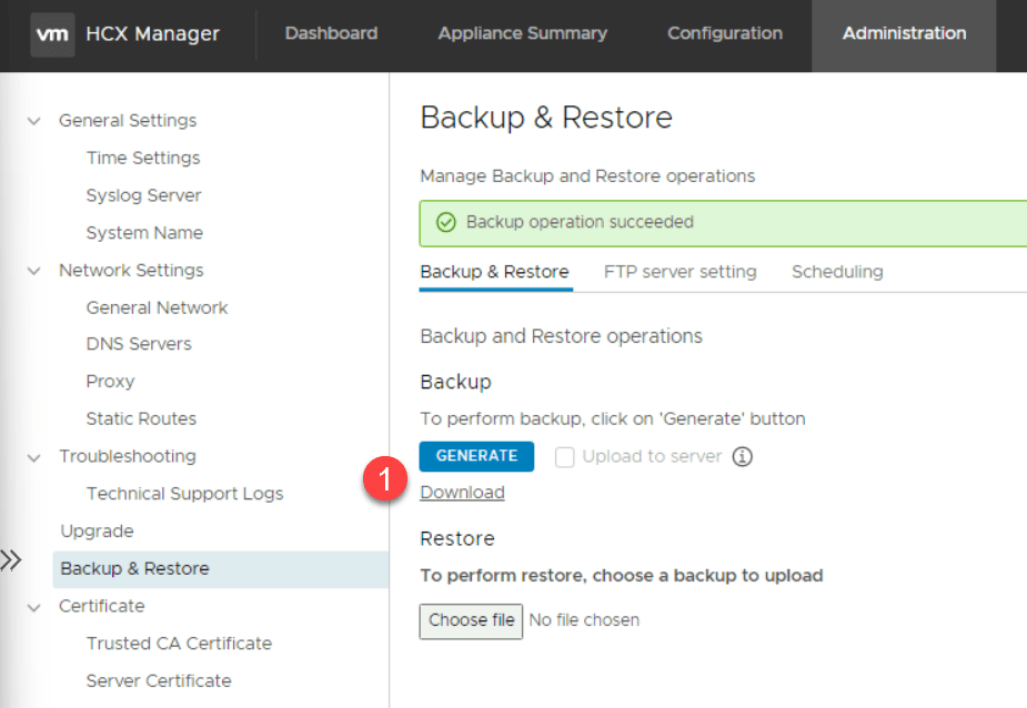 Kopie zapasowe infrastruktury HCXowej wykonuje się z appliance HCX connector z konsoli zarządzającej.