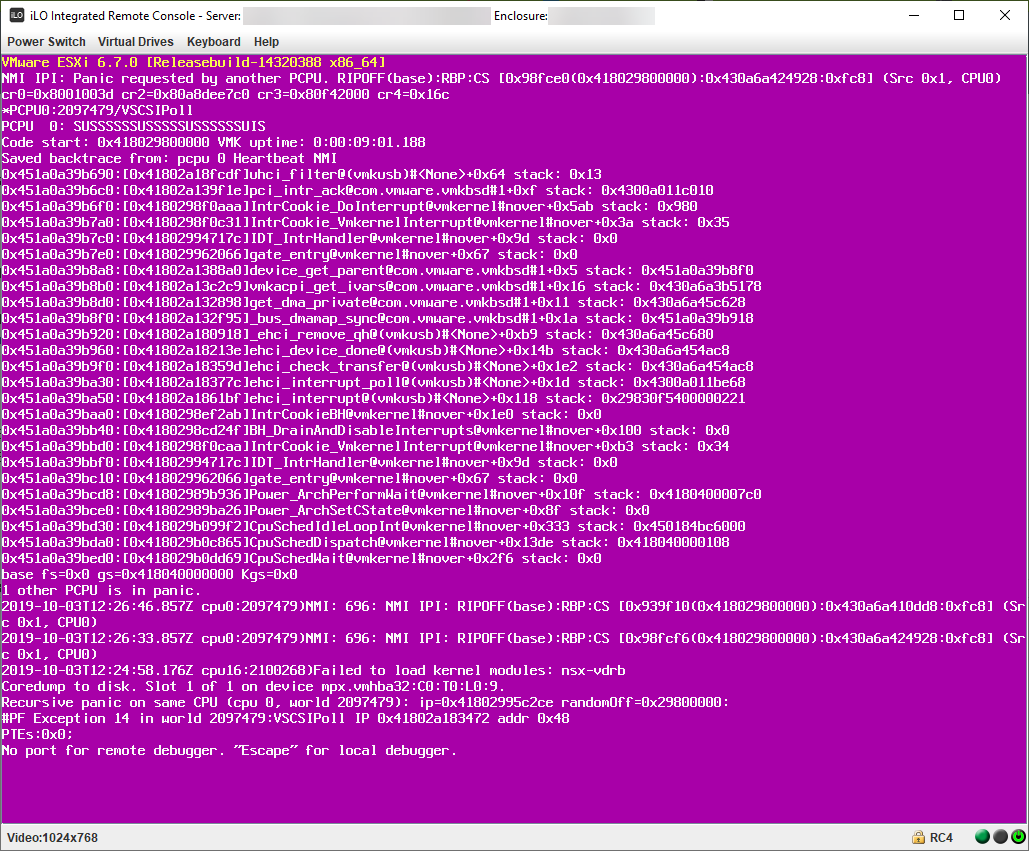 I stało się po zalogowaniu do konsoli zarządzającej piękny fioletowy kolor mógł oznaczać tylko jedno – PSOD (Purple Screen of Death). Oczywiście wtedy uświadomiłem sobie swój błąd bo wczoraj jeszcze o tym pamiętałem…. tak zrobiłem to zaktualizowałem hosta do wersji ESXi, która jest już za wysoka dla tego sprzętu. Maks miał być ESXi 6.5 U2 a teraz jest na ESXi 6.7 U3