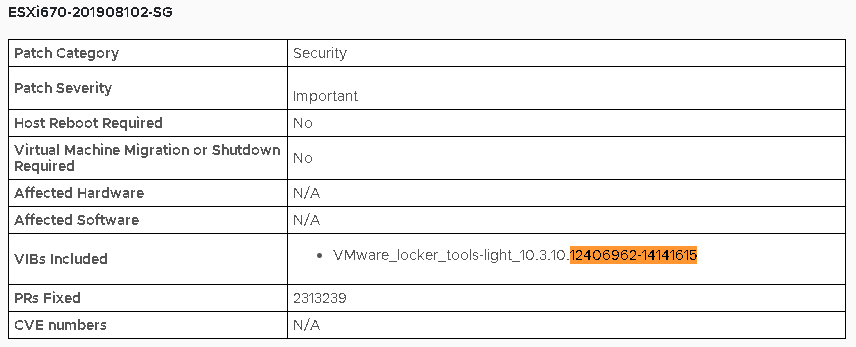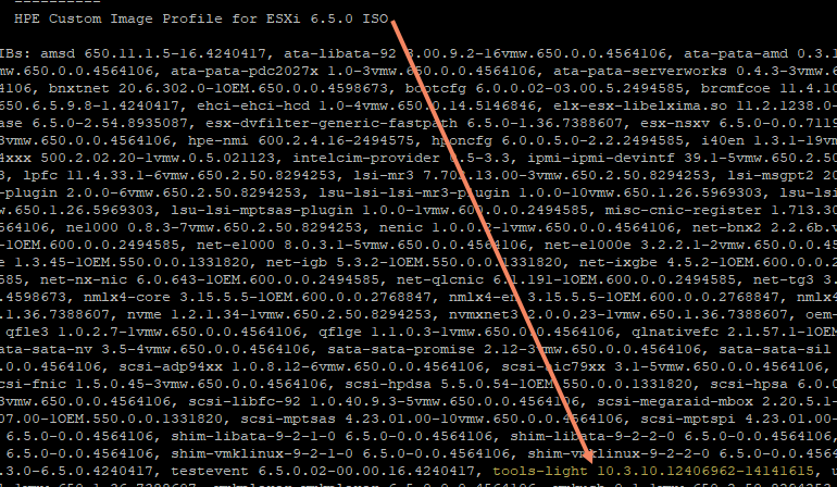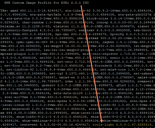 Tak po wersji build tools-light doszedłem do dokumentu z opisem z jakiego patcha on pochodzi “ESXi650-201805102-SG”