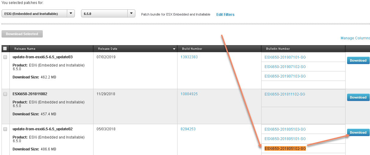 Następnie na podstawie nazwy paczki “ESXi650-201805102-SG” postanowiłem ją sciągnąć na dysk ze strony https://my.vmware.com/group/vmware/patch#search