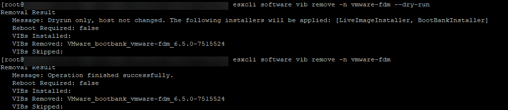 [root@esxi: esxcli software vib remove -n vmware-fdm [DependencyError] VIB VMware_locker_tools-light_10.3.10.12406962-14141615 requires esx-version >= 6.6.0, but the requirement cannot be satisfied within the ImageProfile.