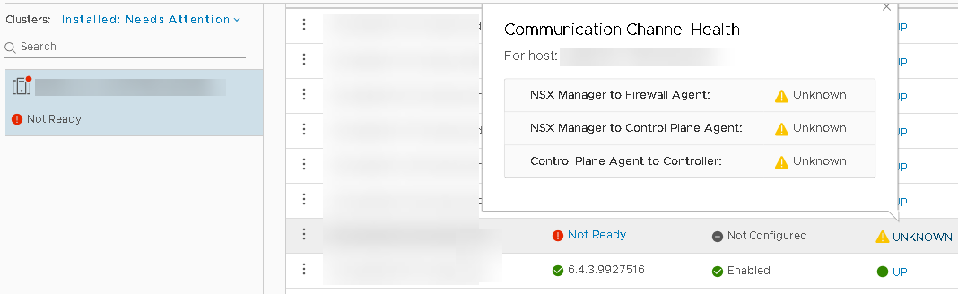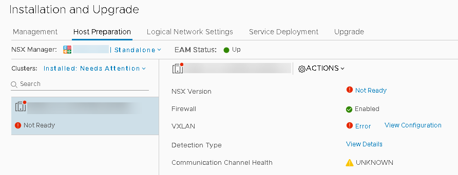 Po ponownym wejściu w hosta w MM (nie jestem pewien czy to było konieczne) NSX ponowił konfiguracje tym razem z powodzeniem.
