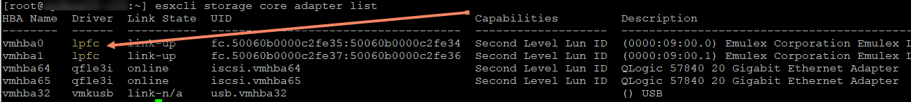 esxcli storage core adapter list albo esxcfg-scsidevs -a