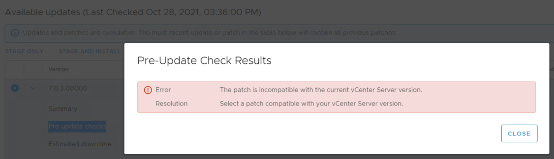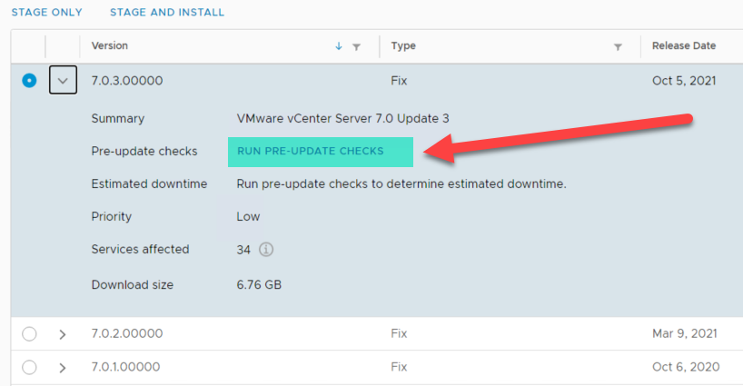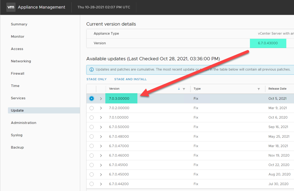 W naszym przypadku obecnie mamy VMware vCenter w wersji 6.7 U3f a weryfikujemy możliwość przejścia na 7 U3a. Takich rzeczy nie zrobimy z tej konsoli. Tutaj natomiast można zrobić aktualizację łatek itp na poziomie tej samej wersji 6.X