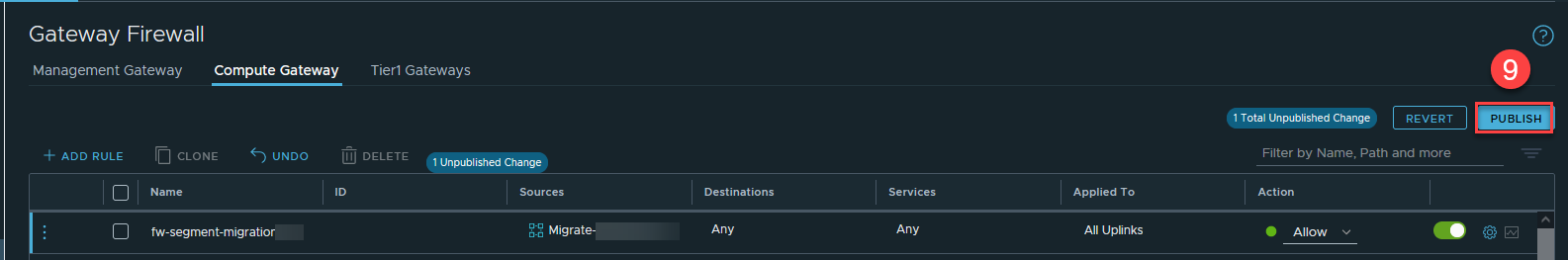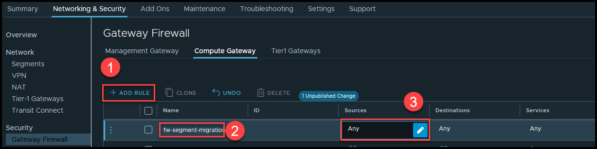 Otwarcie ruchu wychodzącego np. na świat odbywa się dalej przez konsolę firewalla Gateway ( Security > Gateway Firewall > Compute Gateway)